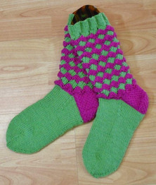 | Aikuisten kissasukat Menekki: pohjaväri 150 g, kissaväri 100 g ja raitaväri 50 g Pyydä ohje lankatilauksesi mukana. Lasten sukkiin teetee Pallas>> | Kiivimansikkasukat Menekki: 100 g vihreä, 50 g pinkki Pyydä ohje lankatilauksesi mukana. | Varrettomat pitsisukat, Koot: 38/39 - 42/43 Menekki: 100 g Pyydä ohje lankatilauksesi mukana |